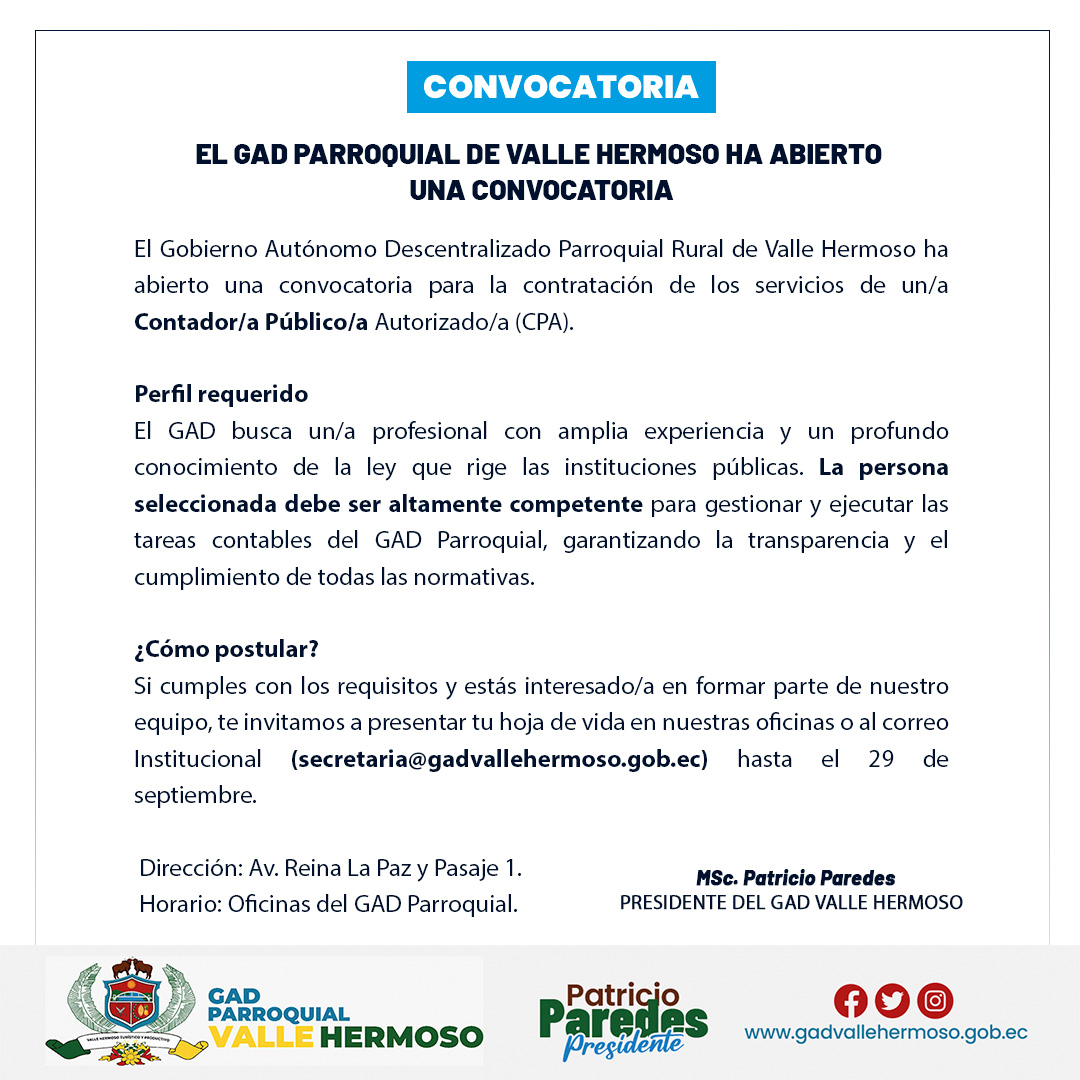 El Gobierno Autónomo Descentralizado Parroquial Rural de Valle Hermoso invita a postular a la siguiente vacante: