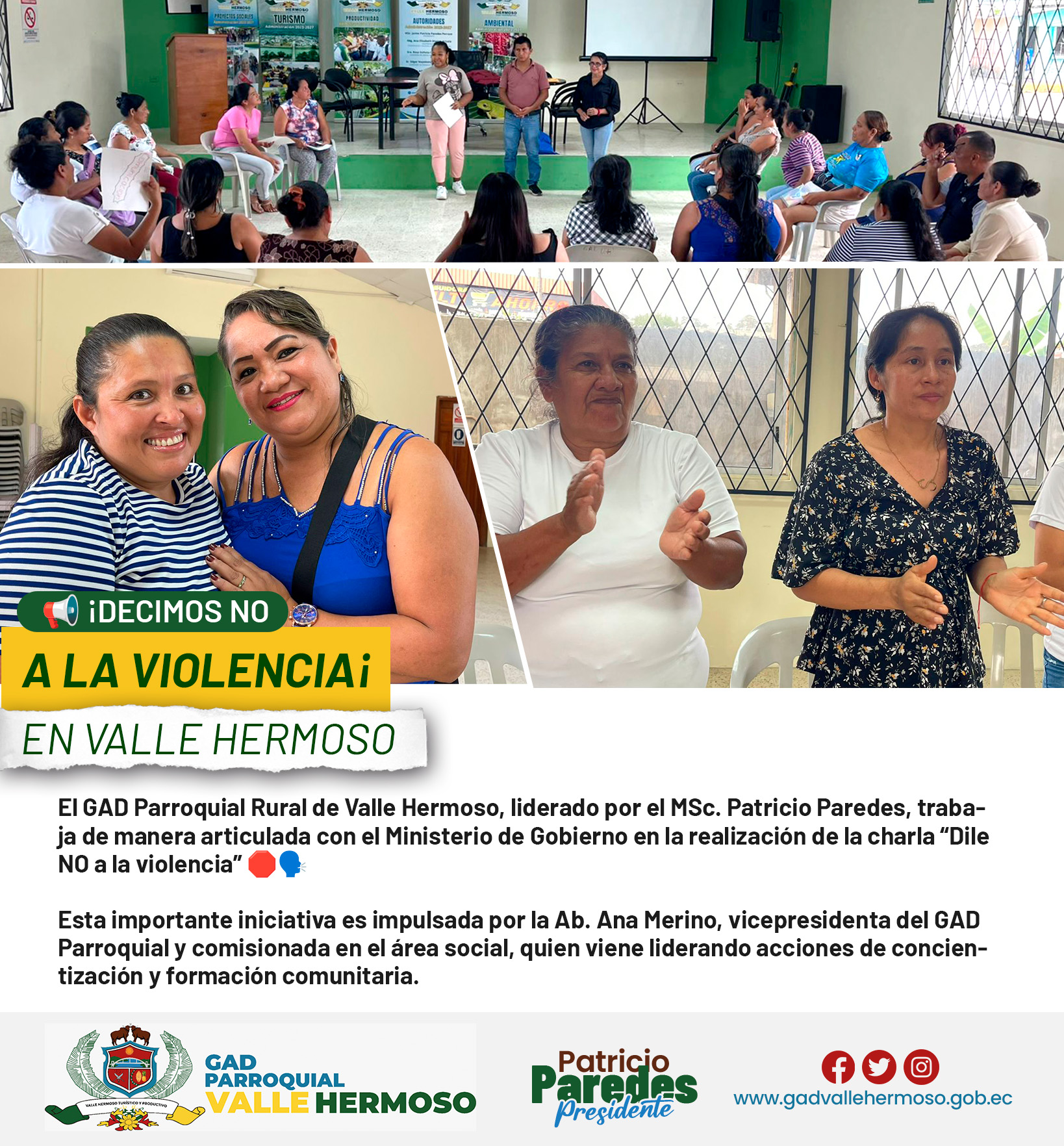 El GAD Parroquial Rural de Valle Hermoso, liderado por el MSc. Patricio Paredes, trabaja de manera articulada con el Ministerio de Gobierno en la realización de la charla “Dile NO a la violencia” 🛑🗣️